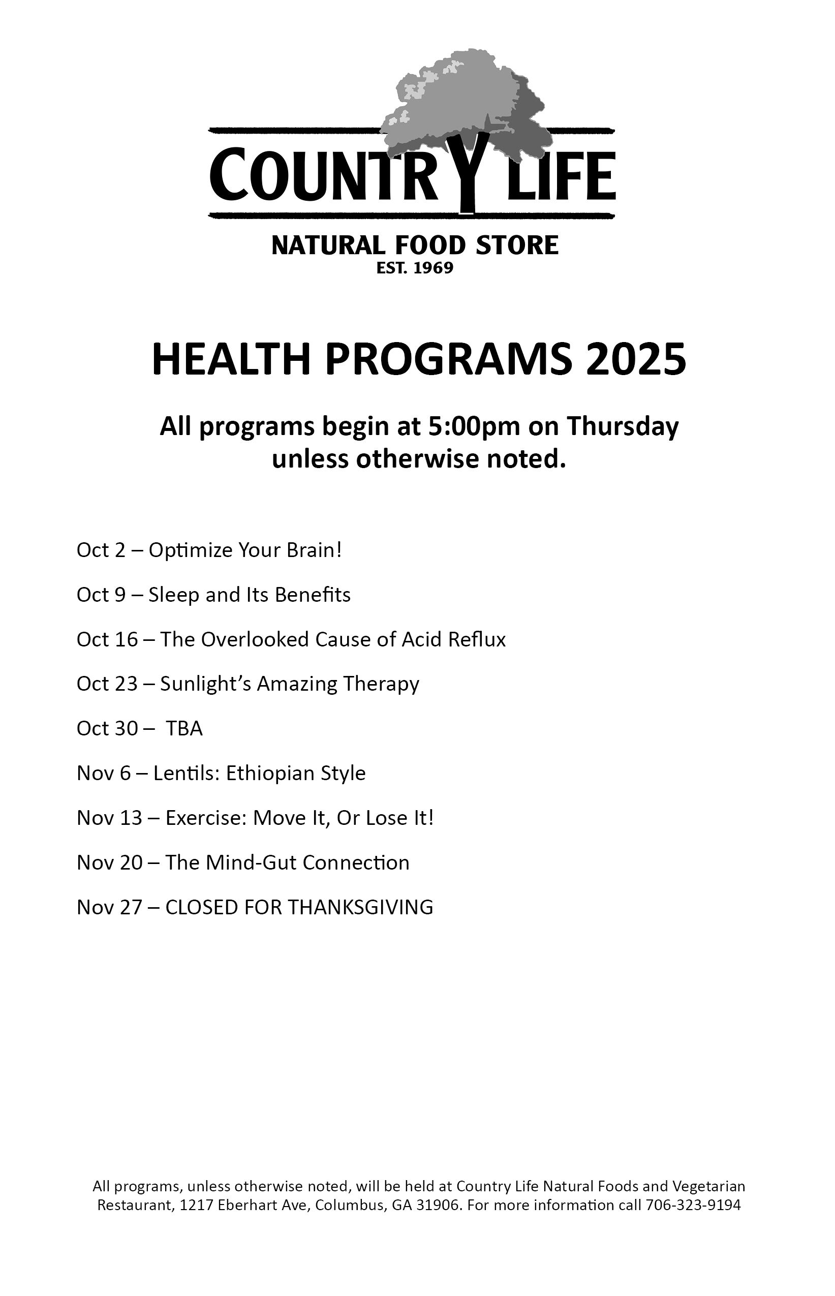 Throughout the year, Country Life offers a wide variety of health programs to the community, such as Cooking Classes, lectures on such topics as Cancer, Diabetes, Mental & Emotional Health, and Diet, as well as interactive presentations on Soap-Making, Hydrotherapy, and Juicing. All of these programs are free of charge (unless food is served or otherwise stated), and begin at 5:00pm unless otherwise noted.